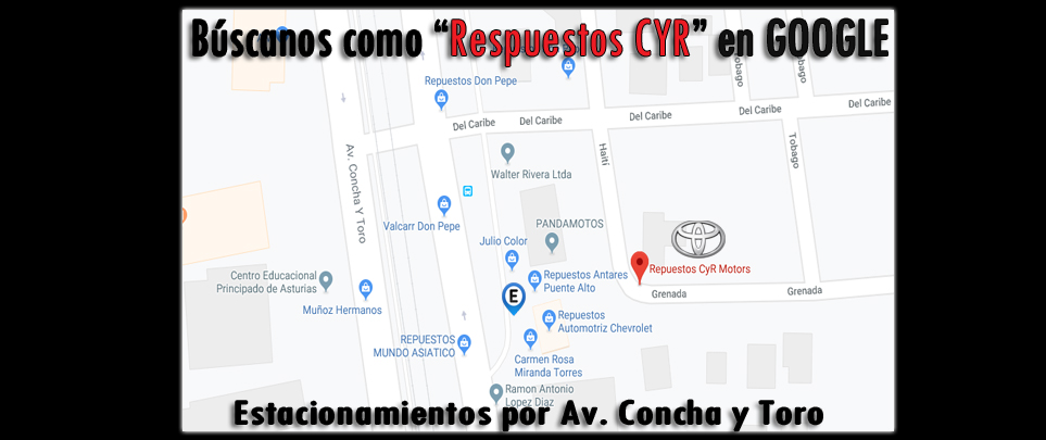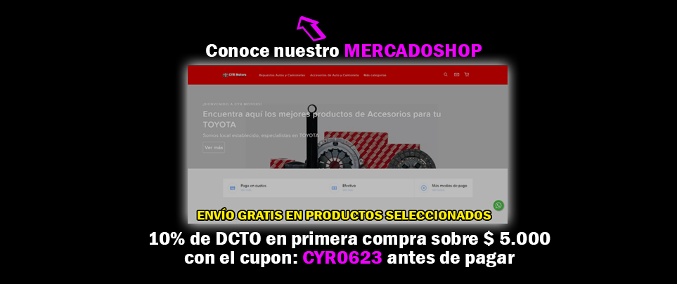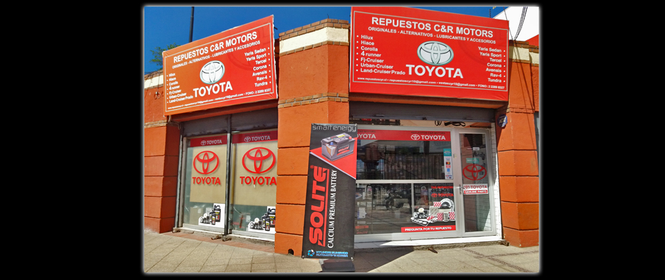 SOMOS REPUESTOS C&R MOTORS, ENFOCADOS EN LA MARCA TOYOTA CON MÁS DE 12 AÑOS DE EXPERIENCIA Y 4 AÑOS EN EL MERCADO AUTOMOTRIZ. SI BUSCAS LA MEJOR OPCIÓN EN PRECIO Y CALIDAD VISÍTANOS, EN NUESTRA TIENDA CONTAMOS CON ESTACIONAMIENTO Y EXCELENTE UBICACIÓN (A PASOS DE METRO SOTERO DEL RIO), AQUÍ PODRÁS ENCONTRAR:
