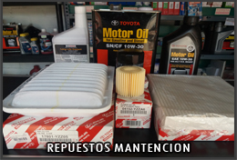 - REPUESTOS TOYOTA ORIGINALES Y ALTERNATIVOS, PARA MANTENCIÓN, COMO TAMBIÉN DE CARROCERÍA, CON AMPLIO STOCK DISPONIBLE PARA ENTREGA INMEDIATA Y A PEDIDO.